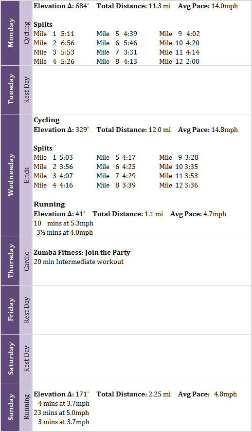I'm happy that Ryan and I mostly followed the training schedule for this week, scaling where appropriate. Here's how the week shaped up: